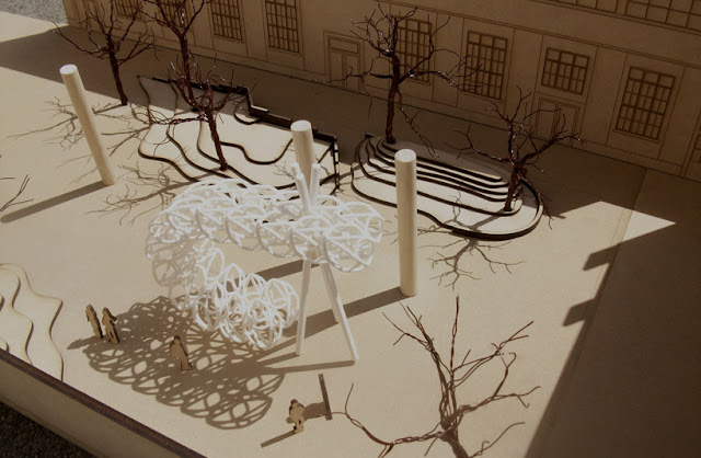 all images courtesy of ball nogues studiolos angeles-based ball nogues studio has created the winning proposal for the second edition of the 'pavillon speciale' competition,a series curated by french architect matteo cainer in collaboration with the ecole spéciale d’architecture in paris, france. the pavilion's shape is produced by the deformation of materials under force, requiring formal explorations with full scale mock-ups to inform computer representations. digitalization of the studies then allow further process development within the studio environment. over 200 repetitive cells made from locally sourced plastic tubing are bent and wrapped within custom jigs. an additional sheet material placed within the modular unit will provide shade to visitors below the continuous canopy.the module may be flat-packed for transportation and quickly assembled on site, supporting the structure's temporary existence.positioned within the heart of the city, the installation will be constructed by the students within a courtyard garden adjacent to the schoolto create a sense of place during diverse weather conditions. the structure will be constructed no more than three months after the design was conceived, serving to dissolve the boundaries between academia and professional world, working together to experiment and learn from each other. the construct may be easily disassembled and relocated when a new location has been determined.